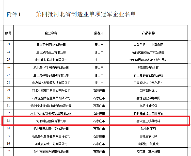 近日,河北省工業(yè)和信息化廳發(fā)布《關(guān)于公布第四批河北省制造業(yè)單項(xiàng)冠軍企業(yè)名單的通知 冀制強(qiáng)省辦〔2022〕25號(hào)》。經(jīng)企業(yè)申報(bào)、各市工信部門推薦、專家評(píng)審、現(xiàn)場抽查、公示,確定了河北省第四批制造業(yè)單項(xiàng)冠軍企業(yè)(產(chǎn)品)名單,通過公示期,河冶科技股份有限公司獲得河北省單項(xiàng)冠軍企業(yè)認(rèn)定。