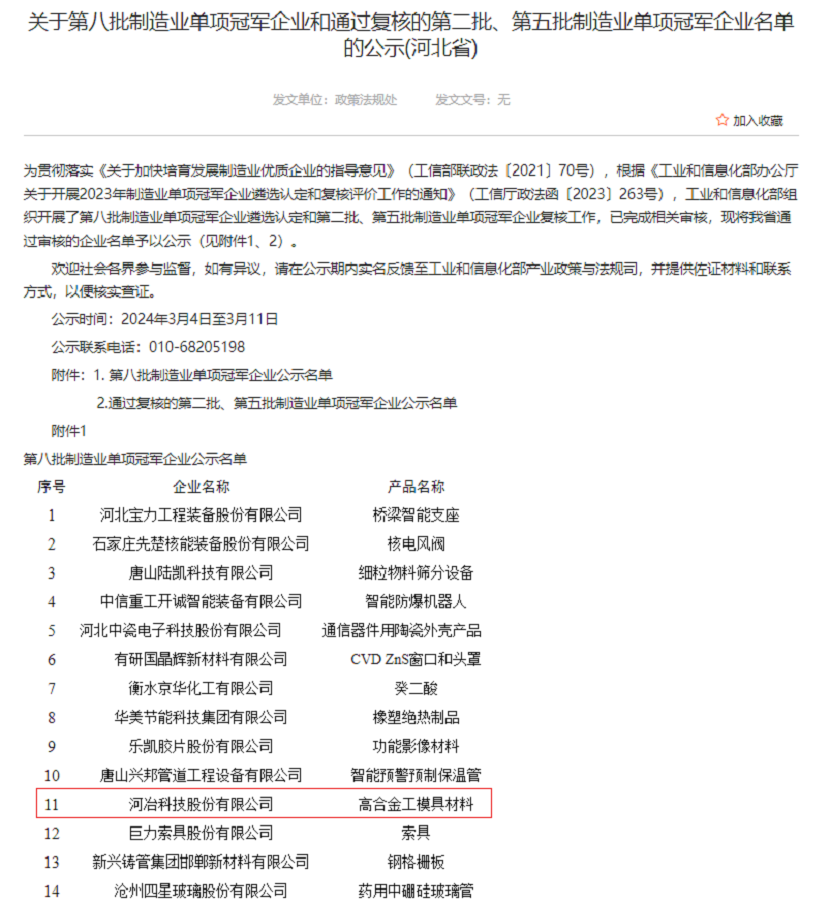 根據(jù)《工業(yè)和信息化部辦公廳關(guān)于開展2023年制造業(yè)單項(xiàng)冠軍企業(yè)遴選認(rèn)定和復(fù)核評價(jià)工作的通知》(工信廳政法函〔2023〕263號),工業(yè)和信息化部組織開展了第八批制造業(yè)單項(xiàng)冠軍企業(yè)遴選認(rèn)定和第二批、第五批制造業(yè)單項(xiàng)冠軍企業(yè)復(fù)核工作,已完成相關(guān)審核,河冶科技股份有限公司被認(rèn)定為第八批制造業(yè)單項(xiàng)冠軍企業(yè)。